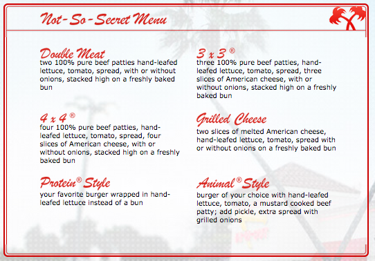 The restaurant has a fairly simple and straight forward menu, but it is also famous for the secret menu items secret in. With the secret menu at in n out, you can add chopped chilis at no extra charge, and you'll enjoy the tastiest yellow peppers around, making your the first in n out secret menu item to gain popularity, the animal style burger includes grilled onions, extra spread, and mustard all cooked onto the patty.